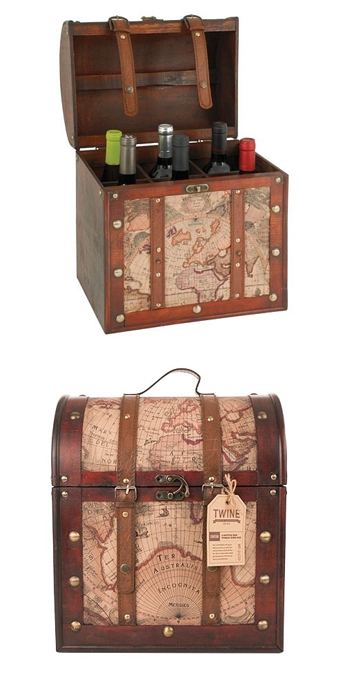 Product Description: Your six (6) best bottles will stay secure while you travel to an earlier time with this Chateau Collection Old World Wine Box. A brass latch and vegan-leather accents lend this handsome teak-wood map design chest an old world charm. PLEASE NOTE: Pictured wine bottles are not included.