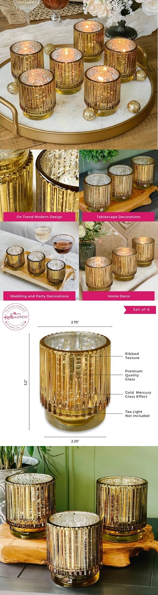 Product Description: When you're searching for centerpieces for tables, an illuminating candle holder will make your celebration stand out from other festivities. The ribbed look of these holders is unique and their delightful design is perfect for a Boho wedding and glows with a gold mercury glass effect with a votive candle inside. Treat your party guests to a candle holder that is a unique wedding favor and feel free to keep these trinkets for yourself as Fall or holidays home decor. HAND WASH ONLY. PLEASE NOTE: Pictured tray, wood cut, table runner, candies, plants, flowers, drinking glasses, and tealight candles are NOT included. Sold as a set of six (6) and prices quoted below are per set.