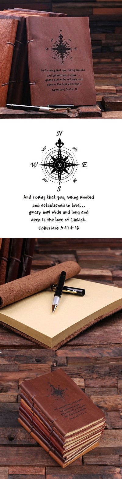 Product Description: This personalized cowhide-leather notebook, with 100 pages of two-sided recycled craft paper inside, may be used as a daily journal, travel diary or even a wedding guest book for a nautical or wanderlust-themed wedding as it features a majestic "Compass Rose" motif. Better yet, it may be engraved with up to five (5) lines of custom text in the font shown (the pictured scriptural text is just an example of what may be engraved). PLEASE NOTE: Pictured pen is not included. Available in brown leather of varying shades -- the journal you receive may be darker or lighter than the one pictured. Better yet, this wonderful gift now enjoys FREE SHIPPING in the U.S.