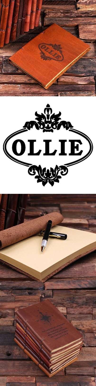 Product Description: This personalized cowhide-leather notebook/journal, with 100 pages of two-sided recycled craft paper inside, features a name inside a classic oval crest motif design. PLEASE NOTE: Pictured pen is not included. Available in brown leather of varying shades -- the journal you receive may be darker or lighter than the one pictured. Better yet, this wonderful gift now enjoys FREE SHIPPING in the U.S.