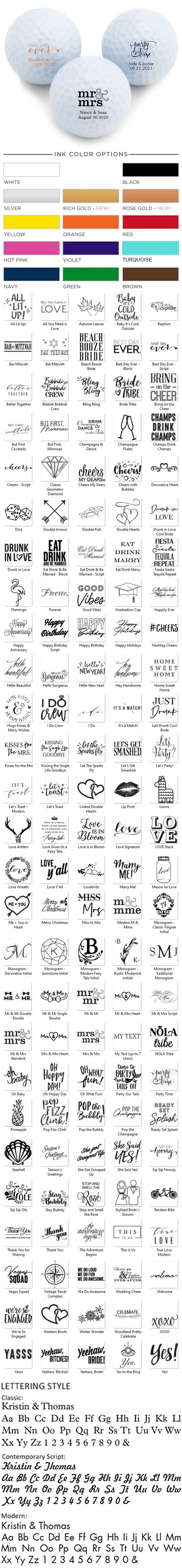 Product Description: The classic white golf ball is a unique table favor for your party guests that may be custom printed with one of our special occasion themed designs. Have classic monogrammed initials, Mr & Mrs, party time, happy birthday, or one of any number of the fun, cute designs, or heartfelt expressions added to the golf ball. The sporty favor is a perfect, little giveaway that's a great idea for golf lovers and a clever way to get personalized golf balls so they're easy to recognize on the course! Each special design has two lines available for your own custom text personalization. Put names on them for the bride and groom, the occasion date, a brief message, or whatever words you want to customize the golf balls for your celebration. Whether that's a wedding reception, engagement party, bridal shower, or another occasion like a birthday, baby shower, or anniversary. A fun, small party gift to take to the greens with you to specially mark your golf ball! PLEASE NOTE: Sold individually. A clear plastic gift box is available for an additional fee. Due to personalization, the minimum order quantity for this item is 12.
